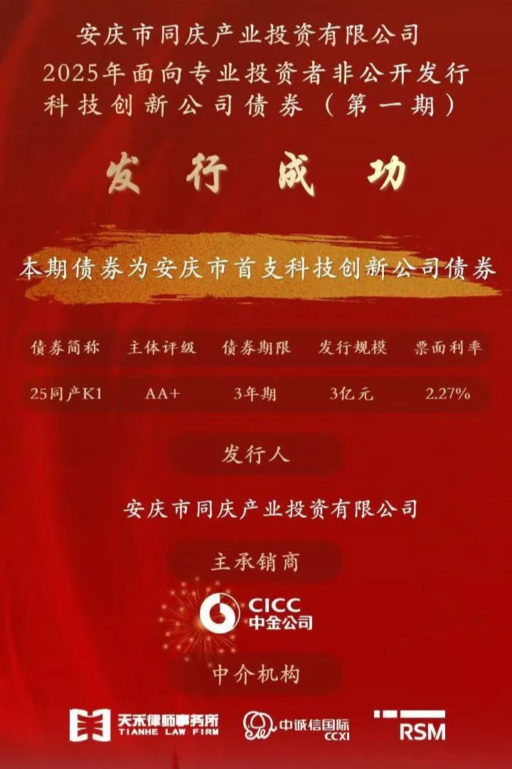 8月12日,同安控股旗下安慶市同慶產(chǎn)業(yè)投資有限公司(以下簡(jiǎn)稱“同慶產(chǎn)投”)成功在上交所發(fā)行2025年科技創(chuàng)新公司債券(第一期),規(guī)模3億元,期限3年,票面利率2.27%,創(chuàng)2025年安徽省同要素可比科創(chuàng)公司債券最低發(fā)行利率,也是2025年以來安徽省非省會(huì)城市首個(gè)無增信措施獲批發(fā)行的科創(chuàng)公司債券。