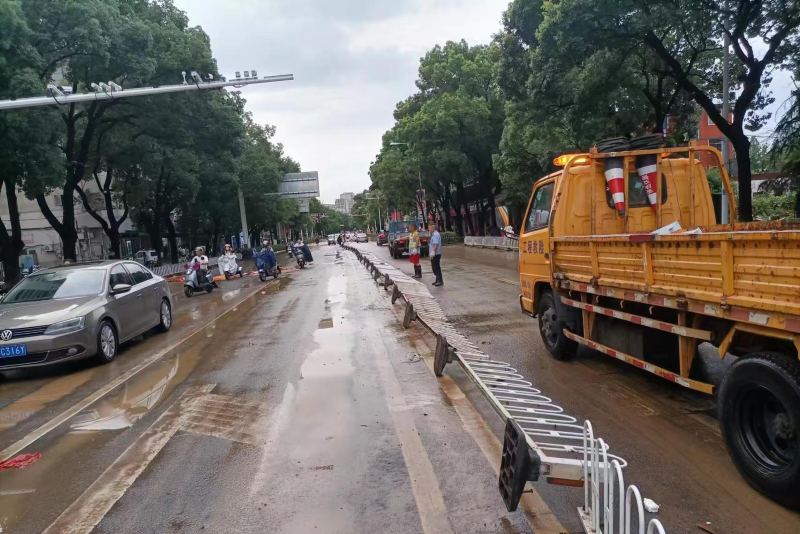 集賢路黃土坑路口路面大面積護(hù)欄倒地,現(xiàn)場(chǎng)立即進(jìn)行搶修恢復(fù);弘陽(yáng)廣場(chǎng)東北路口機(jī)非護(hù)欄在暴雨中全部倒地,存在嚴(yán)重安全隱患,設(shè)施隊(duì)隊(duì)員卷起褲腿趟水前行,搶修恢復(fù)倒伏護(hù)欄,排查過程中122交警指揮中心通知將2處路面護(hù)欄拆除做緊急調(diào)頭點(diǎn)。