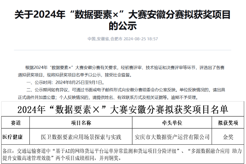 近日,2024年“數(shù)據(jù)要素×”大賽安徽分賽正式落下帷幕,經(jīng)初賽評(píng)審、技術(shù)驗(yàn)證和決賽評(píng)審、公示等環(huán)節(jié),同安控股子公司—安慶市大數(shù)據(jù)資產(chǎn)運(yùn)營(yíng)有限公司申報(bào)的《醫(yī)衛(wèi)數(shù)據(jù)要素應(yīng)用場(chǎng)景探索與實(shí)踐》項(xiàng)目榮獲2024年“數(shù)據(jù)要素×”大賽安徽分賽區(qū)醫(yī)療健康賽道“金獎(jiǎng)”。