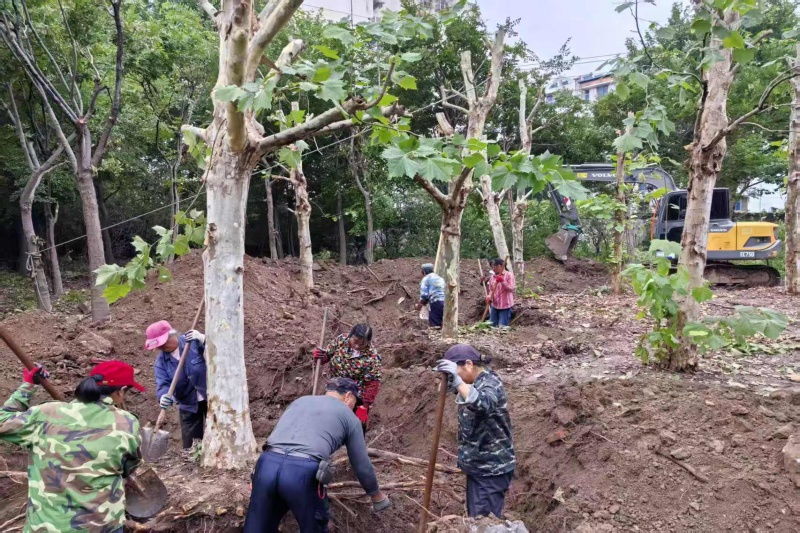 本項(xiàng)目涉及移植樹(shù)木417株、清除無(wú)利用價(jià)值樹(shù)木29株。面對(duì)工期緊、任務(wù)重以及梅雨季節(jié)等諸多挑戰(zhàn),施工隊(duì)制定“人機(jī)協(xié)同+工序并行”方案,采用修剪控冠、分株斷根等專業(yè)技術(shù),配置土球包扎、傷口涂抹修復(fù)劑等保護(hù)措施,優(yōu)化起挖、運(yùn)輸、栽植流程,確保苗木成活率。在清除無(wú)利用價(jià)值樹(shù)木環(huán)節(jié),落實(shí)安全管理措施,對(duì)無(wú)利用價(jià)值的樹(shù)木進(jìn)行安全清除。